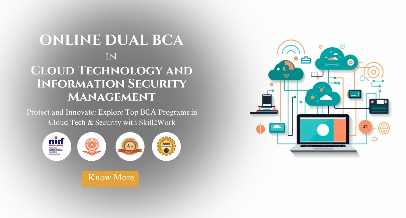 An Online BCA in Cloud Technology and Information Security is an undergraduate program that focuses on the fundamental concepts of cloud computing and the critical aspects of information security. The curriculum of the Online BCA course typically includes subjects such as programming, database management, cloud architecture, network security, cryptography, ethical hacking, and other advanced topics related to cloud technology and information security. This program is designed to equip students with the skills needed to manage, deploy, and secure cloud-based infrastructures, which are essential in today's digital world. Delivered through an online platform, this course provides flexibility for students to study from anywhere, making it ideal for those seeking to balance education with other commitments.