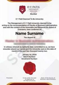 The degree certificate includes the student’s name, programme title, specialization (if applicable), programme duration, and date of completion. It also carries the official university seal and accreditation details, confirming its authenticity and acceptance.